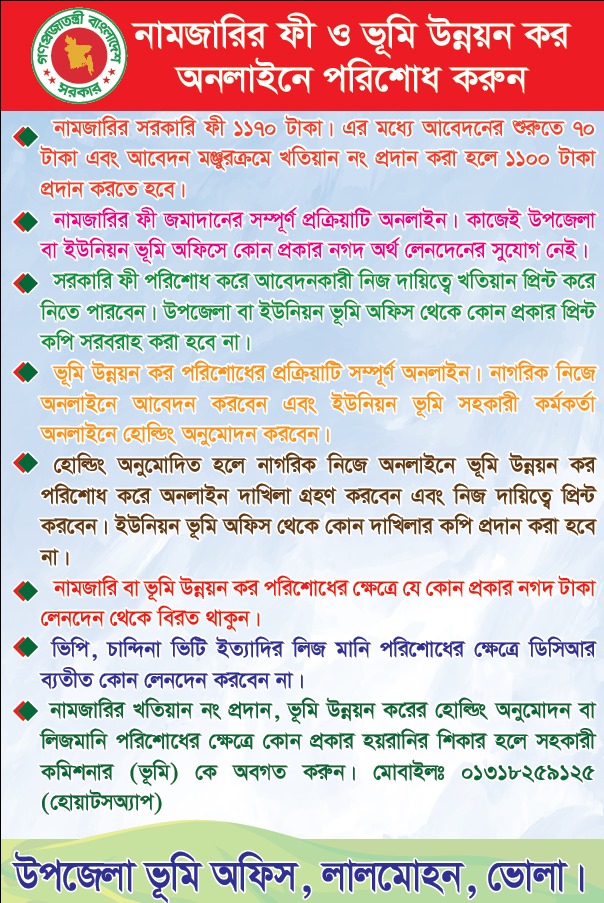 নামজারির খতিয়ান নং প্রদান, ভূমি উন্নয়ন করের হোল্ডিং অনুমোদন বা লিজ মানি পরিশোধের ক্ষেত্রে কোন প্রকার হয়রানির শিকার হলে সহকারী কমিশনার (ভূমি) কে অবগত করুন। মোবাইলঃ 01318259125 (হোয়াটস অ্যাপ)